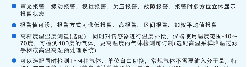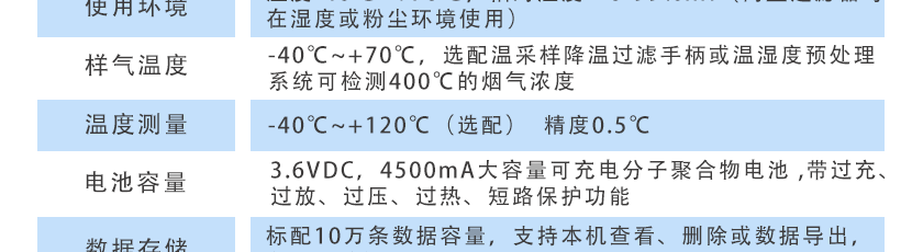 -40℃~+70℃ ,選配高溫采樣降溫過濾手柄,可檢測400度或更高溫度的煙氣濃度 |