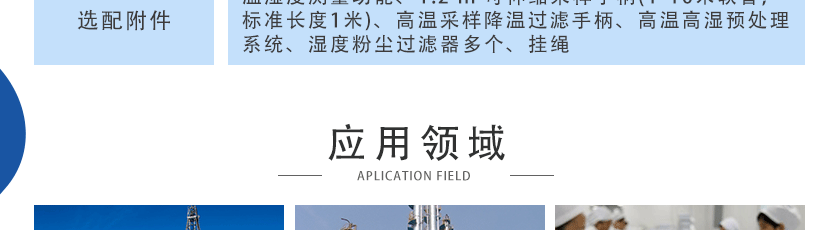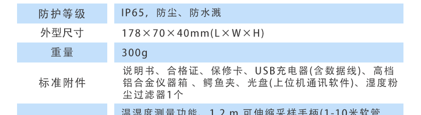 溫濕度測量功能、1.2 m 可伸縮采樣手柄(1-10米軟管,標準長度1米)、高溫采樣降溫過濾手柄、高溫高濕預處理系統、濕度粉塵過濾器多個、掛繩 |