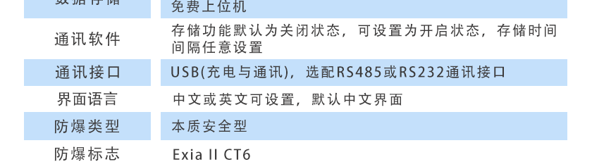 CO(0.1ppm)、H2S(0.01ppm)、O2(0.01%Vol)、Ex(0.1%LEL)、CO2(1ppm)、NOX(0.1ppm),分辨率可訂制:1ppm(0~1000 ppm以上),0.1%LEL(0~100%LEL)、0.01%Vol或0.001%Vol(0~99.999%Vol) |