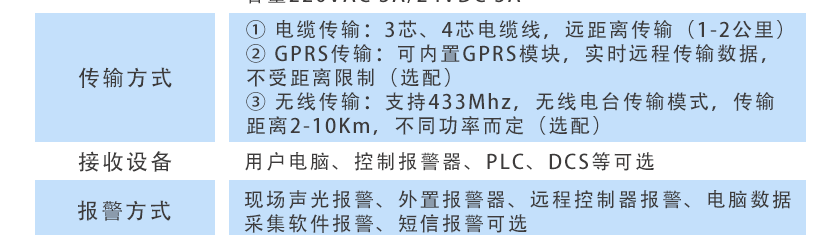 ①電纜傳輸:3芯、4芯電纜線,遠距離傳輸(1-2公里)②GPRS傳輸:可內置GPRS模塊,實時遠程傳輸數(shù)據(jù),不受距離限制(選配)③無線傳輸:支持433Mhz,無線電臺傳輸模式,傳輸距離2-10Km,不同功率而定(選配) |
