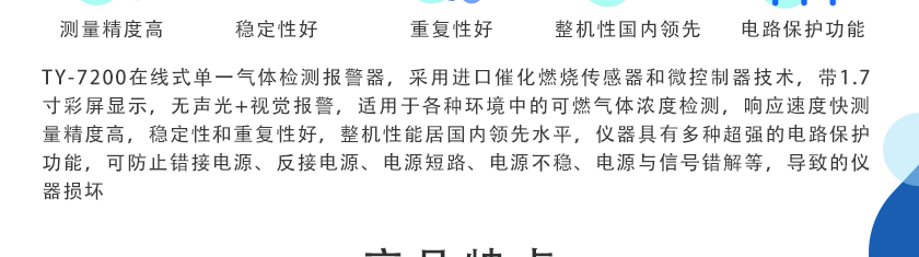 采用進口催化燃燒傳感器和微控制器技術,帶2.5寸高清彩屏實時顯示,無聲光+視覺報警,現場多種氣體濃度 24 小時連續在線監測及溫濕度的測量,適用于各種環境中的可燃氣體濃度檢測,響應速度快,測量精度高,穩定性和重復性好,整機性能居國內領先水平。儀器具有多種超強的電路保護功能,可防止錯接電源、反接電源、電源短路、電源不穩、電源與信號錯解等,導致的儀器損壞。