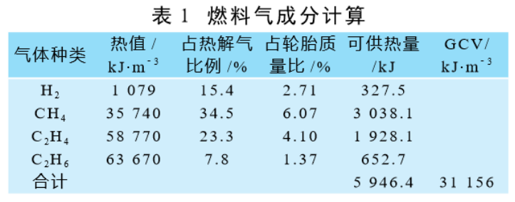 工藝條件不同、廢舊輪胎的差異及計(jì)算方式的誤差都可能導(dǎo)致得出裂解氣的GCV不盡相同。在550℃時(shí)的熱解氣熱值進(jìn)行計(jì)算,氣體量產(chǎn)占輪胎質(zhì)量百分比17.6%,僅計(jì)算熱解氣的主要成分H2、CH4、C2H4、C2H6,計(jì)算結(jié)果如表1所示。