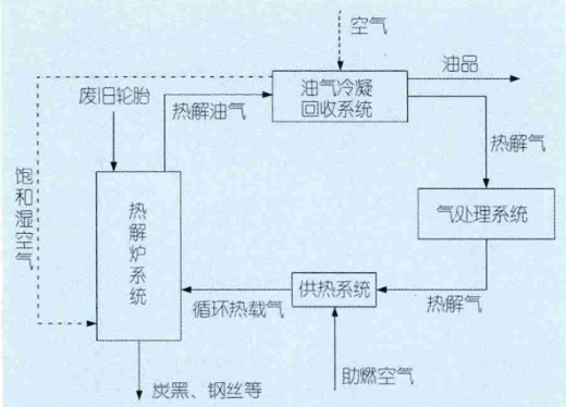 按照工業(yè)生產(chǎn)熱利用率計(jì)算為60%~65%,廢舊輪胎熱實(shí)際所需要的能量約為3005~3255MJ/t,經(jīng)熱解可得15%~20%燃料氣,38%~42%燃料油、34%~36%炭黑和8%~10%鋼絲。每噸輪胎熱解所得熱解氣熱值為5496.4MJ,遠(yuǎn)大于輪胎熱解所需的能量,輪胎熱解過(guò)程所需能量完全可以自給自足,并能儲(chǔ)存余下熱解氣。