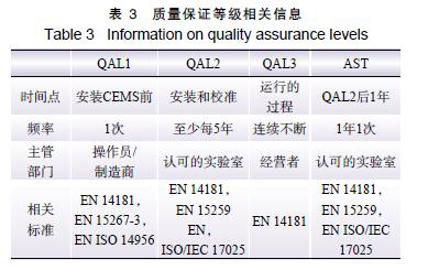歐盟的質(zhì)量控制共包含3 個質(zhì)量保證級別(quality assurance levels,QAL)和1 個年度監(jiān)視測試(annual surveillance test,AST),從儀器的安裝到年度的檢測, 歐盟對數(shù)據(jù)進行持續(xù)性把控,確保數(shù)據(jù)質(zhì)量始終處于規(guī)定的不確定度范圍內(nèi), 及時調(diào)整儀器, 減少系統(tǒng)誤差。各質(zhì)量保證級別測試時間、頻率、主管部門和相關(guān)標(biāo)準(zhǔn)見表3。