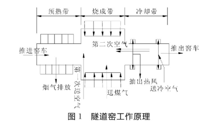 隧道窯可分為三帶∶預熱帶、燒成帶、冷卻帶。坯體(未燒半成品)干燥至一定水分裝載在窯車上入窯,首先經預熱帶,受到來自燒成帶的燃燒產物(高溫煙氣)預熱,然后進入燒成帶,燃料燃燒的火焰及生成的燃燒產物加熱坯體,使達到一定的溫度而燒成。燒成的產品最后進入冷卻帶,將熱量傳給入窯的冷空氣,冷空氣經制品而被加熱后,再抽出送入干燥窯作為干燥生坯的熱源,而磚瓦本身冷卻后出窯。其原理簡圖如圖1所示。