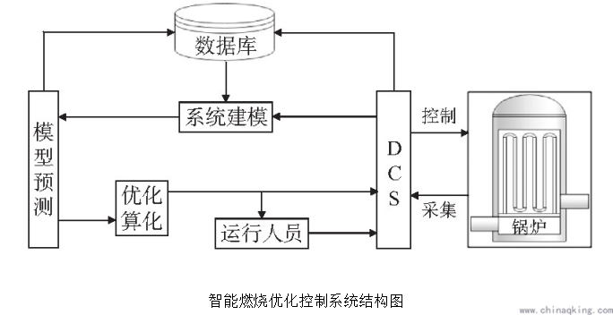 鍋爐智能燃燒優化的實質是通過先進檢測裝置檢測鍋爐各關鍵運行參數并對這些參數進行實時分析處理,然后采用AI優化控制算法在線調整鍋爐運行參數,使鍋爐燃燒的各類運行參數處于最佳狀態。智能燃燒優化系統一般為基于電廠現有DCS控制系統的控制系統,無需對鍋爐進行改造,投資少、風險小且優化效果顯著。如圖1所示為智能燃燒優化控制系統結構圖,系統分為開環操作指導和閉環監控兩種優化方式,開環方式為智能優化系統將各被控量的調節值提交給運行人員,由運行人員手動對DCS系統進行調節;閉環方式為智能優化系統將各被控量的調節指令直接上傳至DCS系統中,自動完成優化調節。結語: