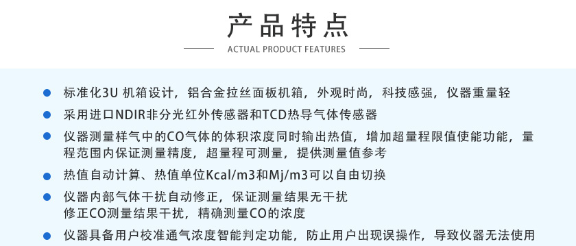 采用自主知識產(chǎn)權(quán)的NDIR非分光紅外技術(shù),主要用于測量氣體中的CO、CO2、CH4、C3H8、SO2、NO等氣體的體積濃度及熱值。全進(jìn)口傳感器、測量精度高、結(jié)構(gòu)簡單、維護(hù)方便,軟件功能強(qiáng)大,可拓展性強(qiáng)、現(xiàn)場實(shí)用性好,目前暢銷國內(nèi)外。