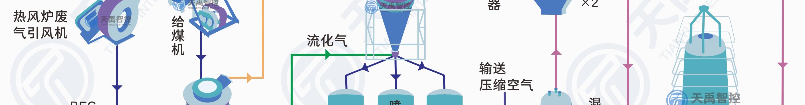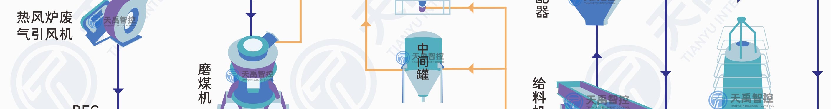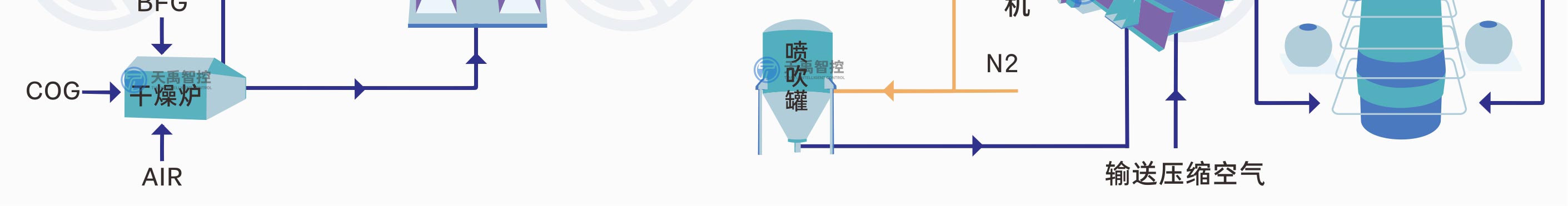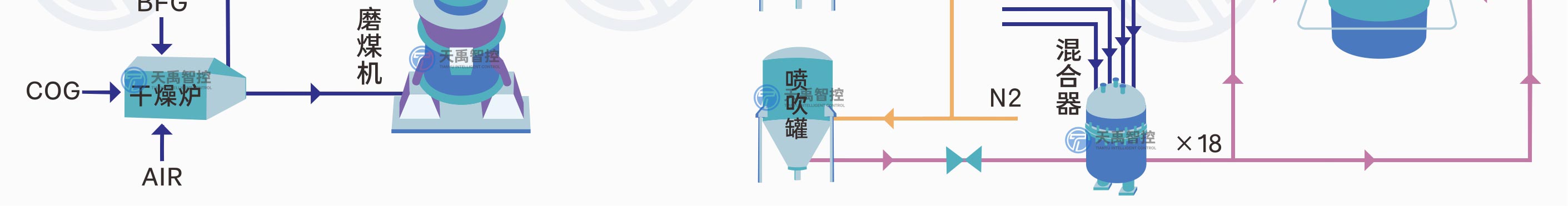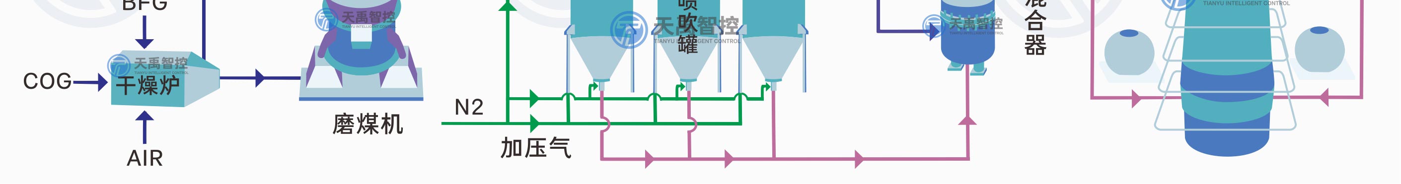 高爐噴煤就是把原煤(無煙煤、煙煤)經(jīng)過烘干、磨細(xì)、收集,然后用壓縮空氣(或氮?dú)猓┹斔?,通過噴煤槍從高爐風(fēng)口直接噴入爐缸的生產(chǎn)工藝。高爐噴煤系統(tǒng)的工藝流程主要由原煤貯運(yùn)、煤粉制備、煤粉噴吹、熱煙氣、供氣和三電自動(dòng)化等幾個(gè)部分組成。