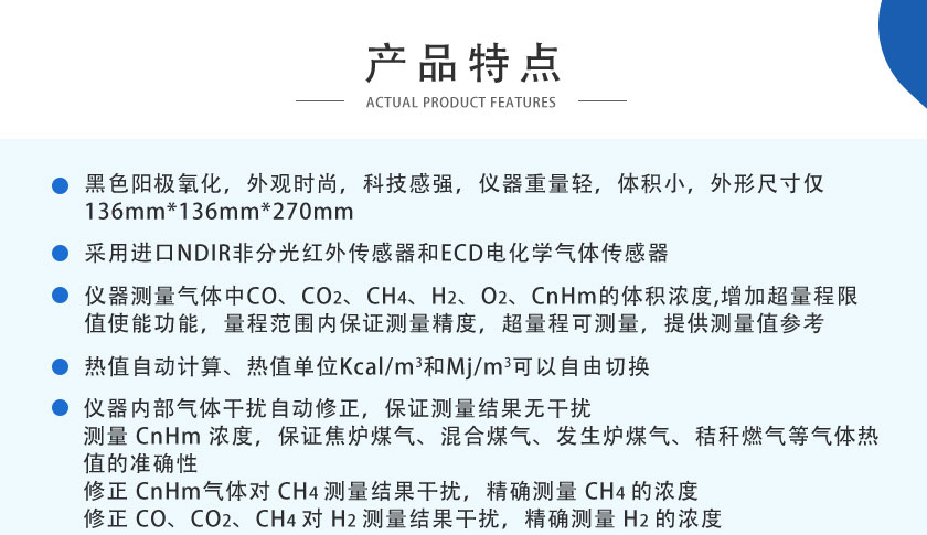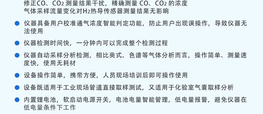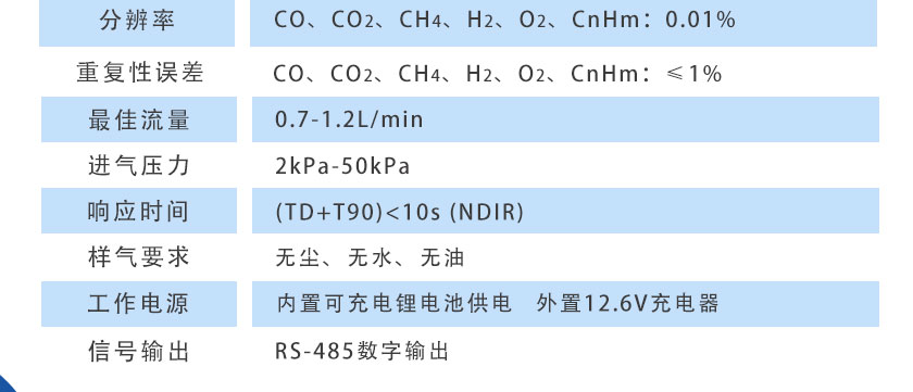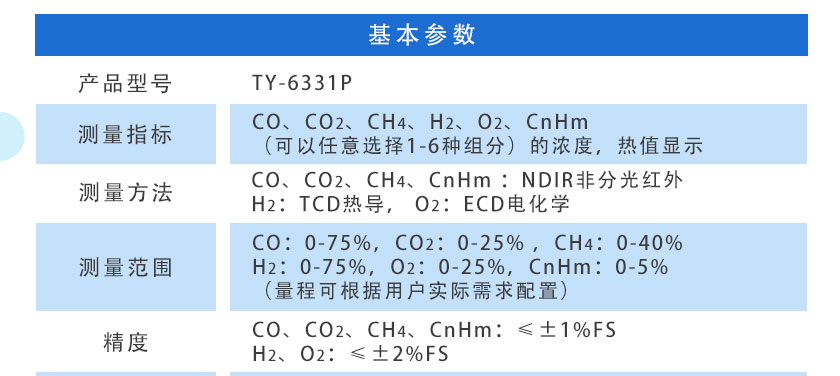 CO、CO2、CH4、CnHm :NDIR非分光紅外;H2:TCD熱導;O2:ECD電化學; |