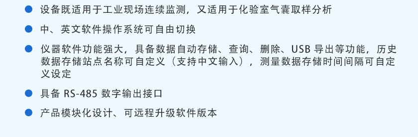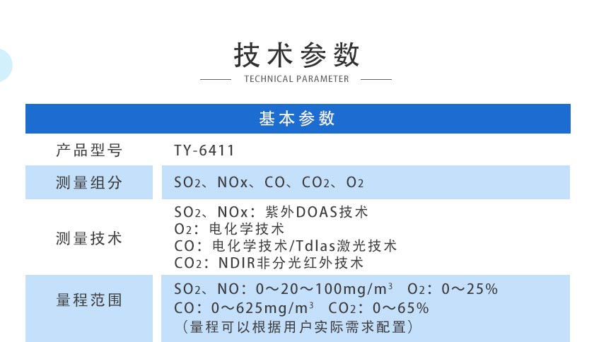 SO2、NOx:紫外DOAS技術(shù); O2:電化學(xué)技術(shù); CO: 電化學(xué)技術(shù)/Tdlas激光技術(shù); CO2:NDIR非分光紅外技術(shù) |