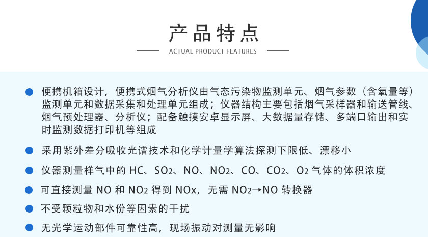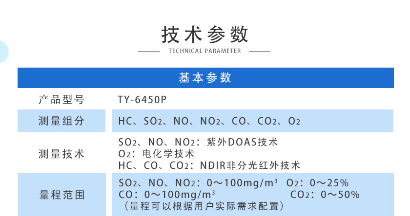 SO2、NO、NO2:紫外DOAS技術(shù);O2:電化學(xué)技術(shù);HC、CO、CO2:NDIR非分光紅外技術(shù) |